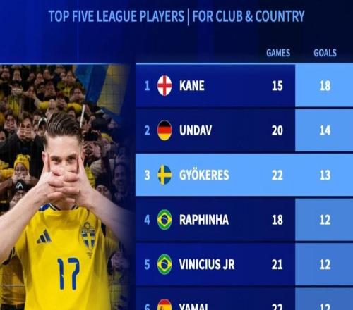 五大聯(lián)賽球員2026年國家隊(duì)+俱樂部進(jìn)球榜:凱恩第1,哲凱第3