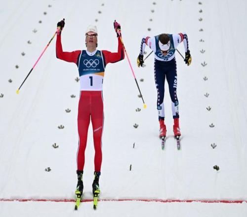 2月10日,挪威選手克萊博(左)在沖過(guò)終點(diǎn)后慶祝。新華社記者 賀燦鈴 攝
