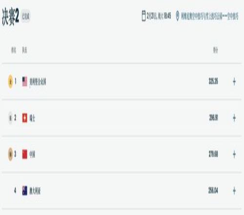 最終,美國隊以325.35分蟬聯(lián)冬奧會該項目冠軍,瑞士隊通過第二輪決賽后兩跳近乎完美的表現(xiàn),拿到296.91分獲得銀牌。澳大利亞隊以256.04分獲得第四名。