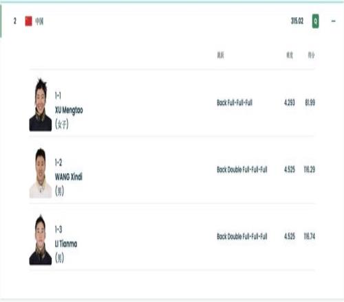 兩跳過后,中國隊總分暫列第三位。最后一跳,小將李天馬登場,同樣高質(zhì)量完成了“Back Double Full-Full-Full”動作,拿到了116.74分,從而幫助中國隊以總分315.02分反超澳大利亞來到第二,作為四個成績最好的隊伍挺進第二輪決賽。