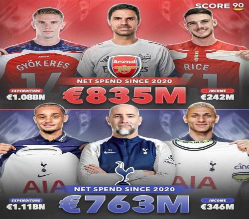來自數(shù)據(jù)媒體Score90的統(tǒng)計(jì),自2020年以來,阿森納在轉(zhuǎn)會(huì)市場(chǎng)引援共花費(fèi)10.8億歐元,收入2.42億歐元,凈支出8.35億歐元;而熱刺共花費(fèi)11.1億歐元,收入3.46億歐元,凈支出7.63億歐元。也就是說阿森納和熱刺兩支球隊(duì)在過去5年轉(zhuǎn)會(huì)費(fèi)投入相差無幾,甚至熱刺還要多出3000萬歐元,但是他們的陣容反而變得越來越差,球隊(duì)如今更是連續(xù)兩個(gè)賽季都排名英超倒數(shù),如果不是上賽季歐聯(lián)杯奪冠,甚至無法獲得歐冠名額。