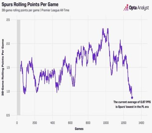 據(jù)統(tǒng)計,托特納姆熱刺在最近38場英超比賽中只拿到了33分,這相當于場均僅0.87分。