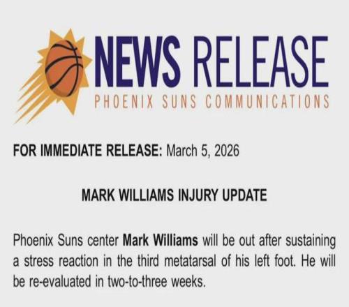 太陽(yáng)官方宣布:馬威左腳第三跖骨出現(xiàn)應(yīng)力反應(yīng)(骨骼過(guò)度使用損傷的早期階段),兩到三周后重新進(jìn)行評(píng)估。