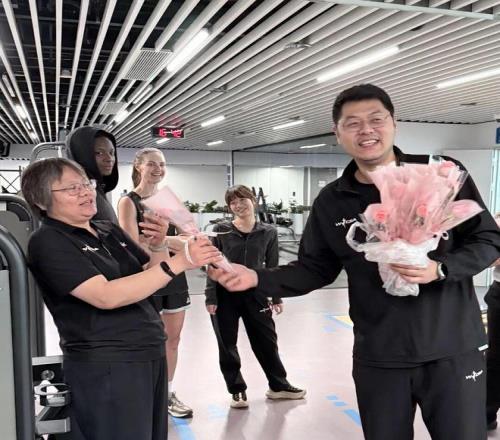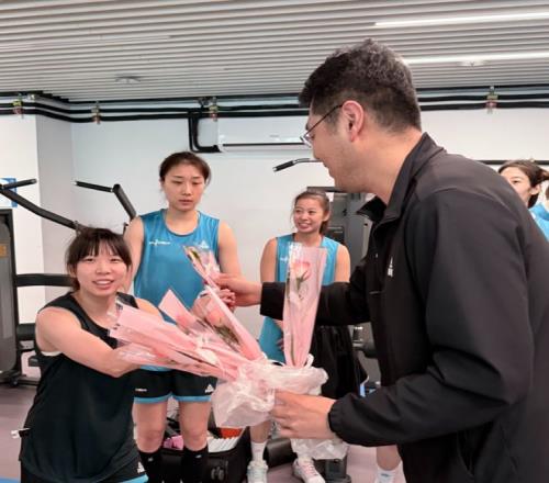 另一邊,俱樂部杯賽區(qū)訓(xùn)練場(chǎng)里,北京首鋼園女籃主教練李翔也將鮮花送到了女籃姑娘們手中。