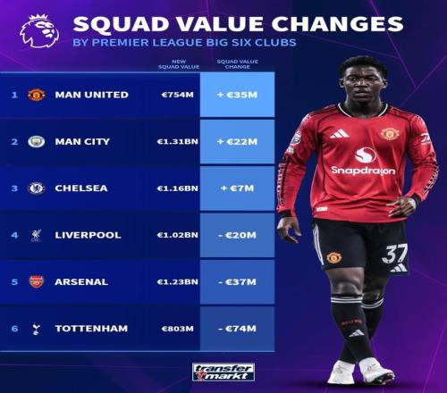 3月9日,德國轉(zhuǎn)會市場網(wǎng)站更新了英超球員身價,并列出了英超BIG6球隊身價變化,曼聯(lián)上漲3500萬歐最多,而熱刺則暴跌7400萬歐。