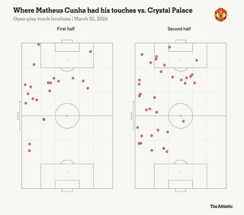 下半場,在水晶宮被罰下一人后,曼聯(lián)有所改觀,部分原因在于庫尼亞開始在更深、更靠邊的位置接球。