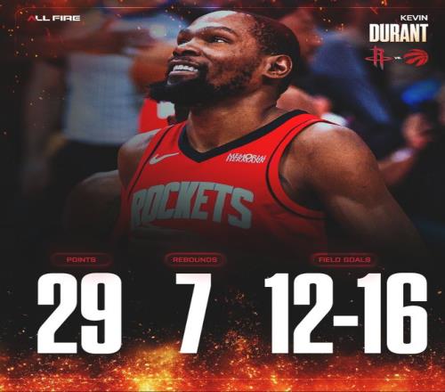 末節(jié)杜蘭特都還沒有登場,依靠小賈連拿8分幫助火箭拉開分差,末節(jié)KD只打了2分鐘拿到2分2籃板1助攻1蓋帽就打卡下班了,全場比賽33分鐘,16中12,三分5中4,罰球2中1拿到29分7籃板2助攻2搶斷2蓋帽,命中率75%,三分命中率80%,真實命中率85.9%。