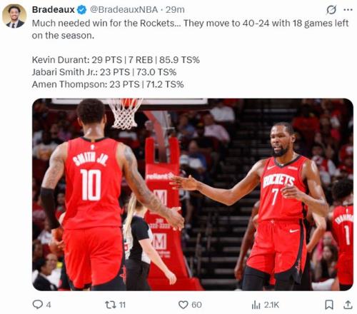 北京時間3月11日,火箭以113-99大勝猛龍。這場比賽火箭是在末節(jié)一波流擊垮猛龍,不過上半場是杜蘭特與小賈苦苦支撐,37歲的老將有體能時的確無解,火箭此役后拿到第40場勝利,火箭也重返西部第三的席位(湖人VS森林狼還沒打)。