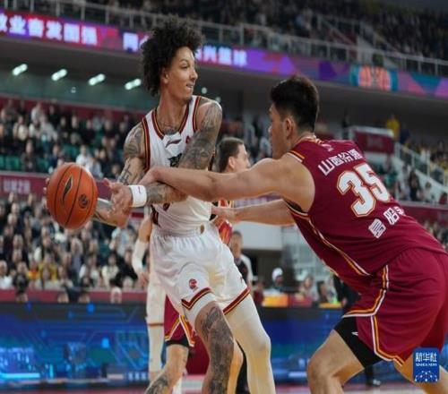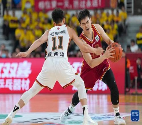 3月11日,吉林長白山恩都里隊球員姜偉澤(左)和山西汾酒隊球員于米提在比賽中爭搶。新華社記者 楊晨光 攝