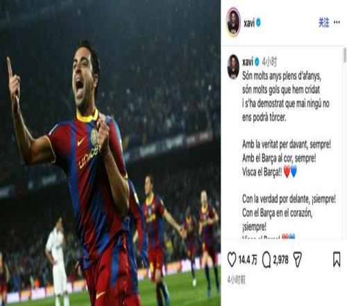 這位巴薩傳奇在帖文開頭還引用了巴薩隊歌中的一句歌詞:“Són molts anys plens d'afanys, son molts gols que hem cridat i s'ha demostrar que mai ningú no ens podrà tòrcer?!保ㄒ鉃椋哼@是許多年充滿拼搏的歲月,這是無數(shù)次我們高聲吶喊的進球,也早已證明,沒有人能夠讓我們屈服。)