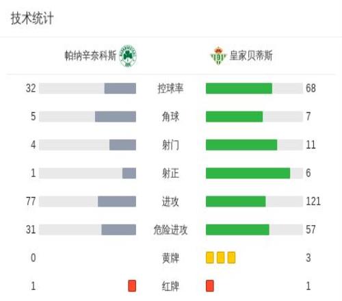 北京時間3月13日歐足聯(lián)歐洲聯(lián)賽 1/8決賽首回合,帕納辛奈科斯對陣皇家貝蒂斯。下半場扎魯里兩黃一紅被罰離場,希維德爾斯造點,塔沃爾達點射打入制勝球,迭戈-略倫特兩黃一紅被罰離場。最終比分帕納辛奈科斯 1-0 皇家貝蒂斯。