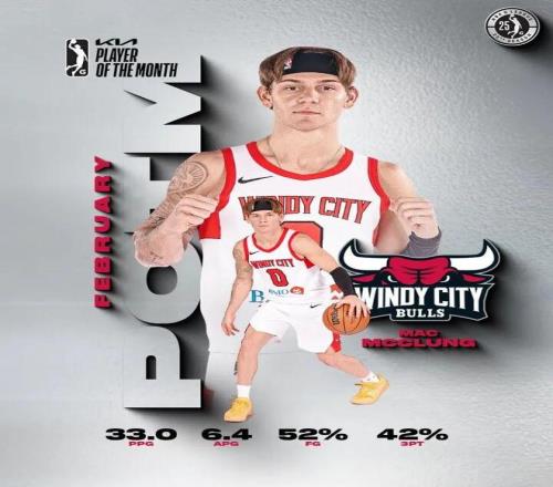 二月份的時候,麥克朗還當(dāng)選了G聯(lián)賽的月最佳球員,當(dāng)時他場均可以拿到33分4助攻2搶斷,投籃命中率52%,三分命中率42%。