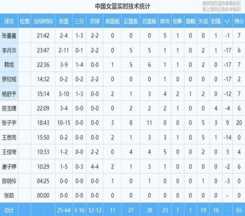 半場數(shù)據統(tǒng)計,中國女籃只有一名球員的得分上雙,就是張子宇12分6板,其他兩大內線李月汝2分3板、韓旭3板1助,本場比賽狀態(tài)不佳,也跟被限制有關。