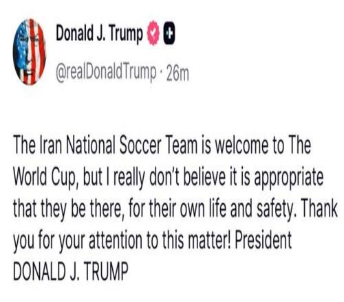 首先引爆輿論的是,美國(guó)總統(tǒng)特朗普的一番爭(zhēng)議言論。他在個(gè)人社交媒體上,公開談到伊朗隊(duì)參加世界杯的問題。他表示:“歡迎伊朗隊(duì)參加世界杯,但出于對(duì)他們自身生命安全的考慮,我真的認(rèn)為他們不適合出現(xiàn)在世界杯?!?/p>