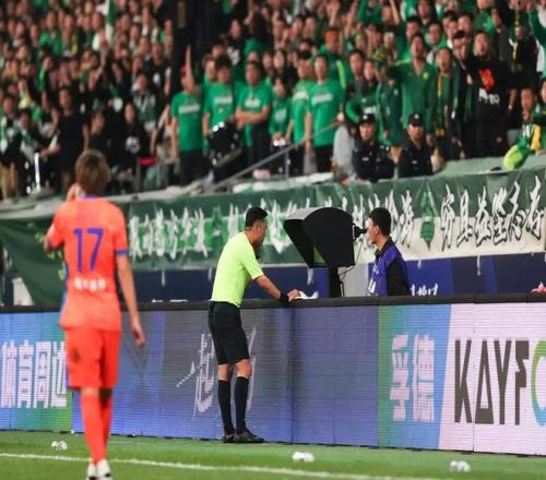 去年4月的京魯大戰(zhàn),唐順齊在場邊回看VAR。(資料片)新華社發(fā)