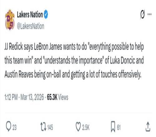 對(duì)此,賽后雷迪克稱贊道:“勒布朗渴望勝利,他愿意盡一切可能幫助球隊(duì)贏球,哪怕角色有所調(diào)整,在東契奇加盟后,他已經(jīng)做出了不少的犧牲,但他還是明白讓東契奇和里夫斯有更多持球時(shí)間的重要性,這說明了他對(duì)球隊(duì)的關(guān)心程度,以及對(duì)身旁隊(duì)友的重視?!?/p>