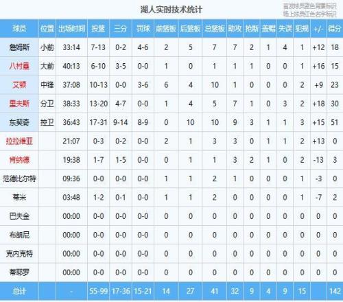 東契奇51分10板9助3斷、里夫斯30分5板7助、艾頓23分10板1助、詹姆斯18分7板7助2斷、八村塁15分1板1助、肯納德3分1板3助2斷、蒂米2分2板、拉拉維亞3板3助、范德比爾特2板1助