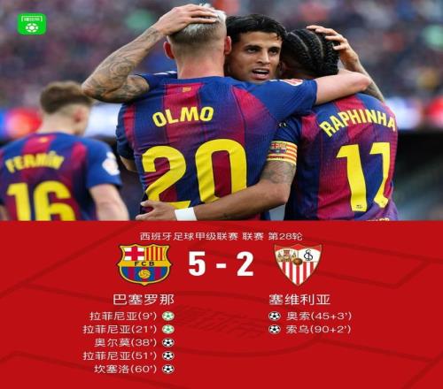 北京時間3月15日西班牙足球甲級聯(lián)賽 聯(lián)賽 第28輪,巴塞羅那主場對陣塞維利亞。上半場坎塞洛造點(diǎn),拉菲尼亞打進(jìn)勺子點(diǎn)球,之后坎塞洛造手球,拉菲尼亞點(diǎn)球雙響,隨后貝爾納爾傳球發(fā)生折射,奧爾莫破門,半場補(bǔ)時階段奧索破門扳回一球。下半場拉菲尼亞折射破門上演帽子戲法,之后坎塞洛長驅(qū)直入扣過防守后破門斬獲回歸后首球,補(bǔ)時階段奧索傳中,索烏頭球破門扳回一球。最終巴薩5-2戰(zhàn)勝塞維利亞。