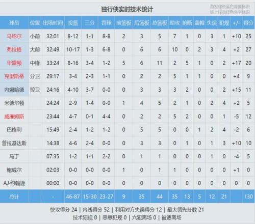 獨(dú)行俠狀元弗拉格出戰(zhàn)33分鐘,投籃17中10,三分3中1,罰球8中6,砍下27分6籃板10助攻2蓋帽,末節(jié)獨(dú)得12分。馬紹爾12投8中,高效率砍下25分5籃板7助攻1搶斷,正負(fù)值+10。PJ-華盛頓16投8中,得到20分11籃板2助攻。