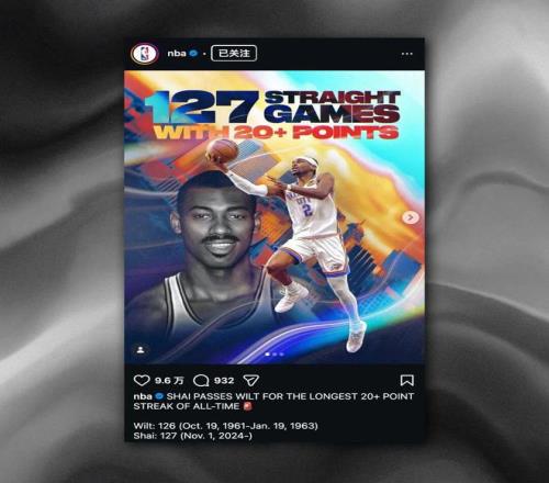 雷霆隊球星 SGA 謝伊·吉爾杰斯-亞歷山大以連續(xù) 127 場比賽得分 20+ 的神勇表現(xiàn),正式超越籃球皇帝張伯倫在 1963 年 1 月創(chuàng)下的 126 場紀(jì)錄,成為該項數(shù)據(jù)當(dāng)之無愧的「歷史第一人」。