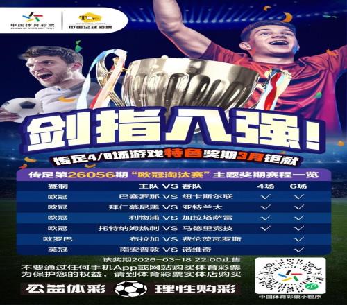 傳足4/6場游戲特色獎期第26056期競猜對象為歐冠1/8決賽次回合,以及歐羅巴和英冠的賽事。具體對陣為歐冠的巴塞羅那VS紐卡斯爾聯(lián)、拜仁慕尼黑VS亞特蘭大、利物浦VS加拉塔薩雷、托特納姆熱刺VS馬德里競技、歐羅巴的布拉加VS費倫茨瓦羅斯,以及英冠的南安普敦VS諾維奇。