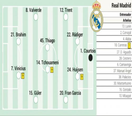 替補(bǔ):13-盧寧、2-卡瓦哈爾、4-阿拉巴、18-卡雷拉斯、27-阿瓜多、28-塞斯特羅、6-卡馬文加、37-曼努埃爾·安赫爾、38-帕拉西奧斯、30-馬斯坦托諾、16-貢薩洛、10-姆巴佩