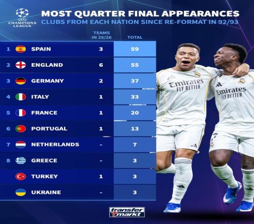 9293賽季以來晉級歐冠8強次數(shù):西班牙球隊59次最多,英格蘭55次 Twitter 2026-03-17 20:18:45 體育播報3月17日宣 德國轉(zhuǎn)會市場統(tǒng)計了1992-1993賽季歐冠改制以來各國球隊晉級8強的次數(shù),并列出榜單,西班牙59次最多,英格蘭55次第二。92-93賽季以來各國球隊晉級歐冠8強次數(shù):西班牙——59英格蘭——55德國——37意大利——33法國——20葡萄牙——13荷蘭——7希臘——3土耳其——3烏克蘭——3足球免費觀看_英超免費觀看_西甲免費觀看_足球高清在線_英超高清在線_西甲高清在線 足球 英超 西甲 意甲 德甲 法甲 歐冠 上一篇: 首回合03失利,曼城官推曬海報預熱對陣皇馬,B席單人出鏡 下一篇: 切爾西青訓總監(jiān)致家長信:關(guān)于舊所有權(quán)歷史監(jiān)管問題與英超達協(xié)議