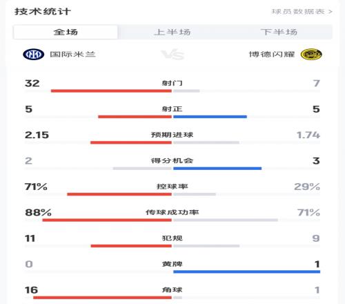 國米vs博德閃耀次回合全場數(shù)據(jù):