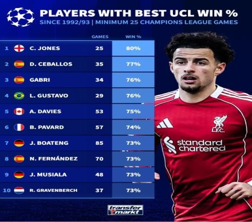 體育播報3月18日宣 德國轉(zhuǎn)會市場盤點了1992-93賽季歐冠改制以來,至少出戰(zhàn)25場比賽的球員勝率情況,利物浦的柯蒂斯·瓊斯以80%的勝率居首。