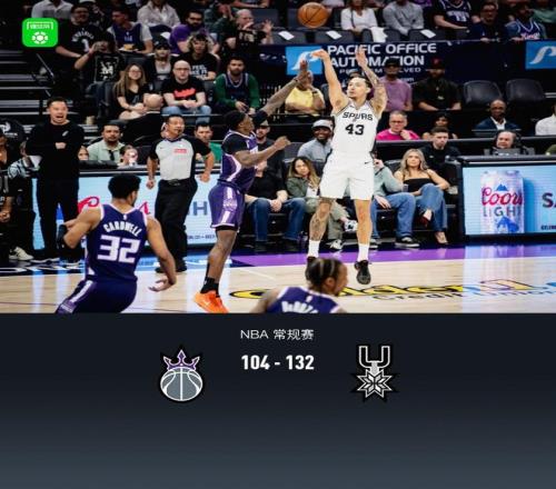 第四節(jié)國王馬克西姆-雷諾拿下6分,馬刺凱爾登-約翰遜拿下7分,最終國王104-132不敵馬刺