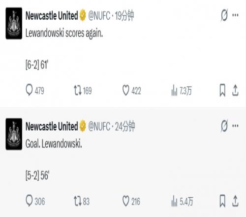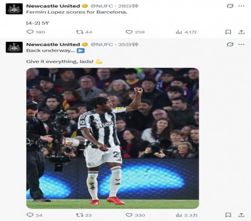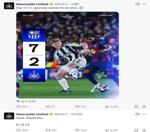 體育播報(bào)03月19日宣 歐冠16強(qiáng)次回合,巴薩7-2總比分8-3狂勝紐卡。紐卡下半場泄氣,后半場比賽變成了巴薩單方面的比賽。紐卡官方X除了在下半場開始時(shí)說了句“小伙子們?nèi)σ愿啊焙?,除了發(fā)布換人信息,之后的時(shí)間變成了報(bào)分機(jī)器人。