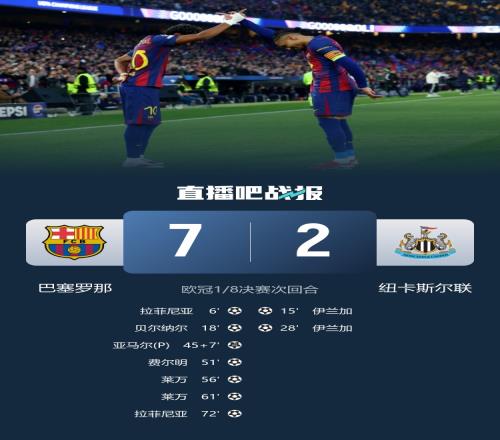 好起來了!巴薩連續(xù)3年進(jìn)歐冠8強(qiáng),此前連續(xù)2年止步小組賽 直播吧 2026-03-19 07:10:46 體育播報(bào)03月19日宣 歐冠1/8決賽次回合,巴薩7-2大勝紐卡,連續(xù)三年晉級(jí)歐冠八強(qiáng)。巴薩近5年歐冠戰(zhàn)績25/26賽季:8強(qiáng)?24/25賽季:4強(qiáng)23/24賽季:8強(qiáng)22/23賽季:小組賽21/22賽季:小組賽足球免費(fèi)觀看_西甲免費(fèi)觀看_巴塞羅那免費(fèi)觀看_足球高清在線_西甲高清在線_巴塞羅那高清在線 足球 西甲 巴塞羅那 上一篇: 拉菲尼亞本場數(shù)據(jù):2射2傳+6關(guān)鍵傳球1過人成功,評(píng)分10.0 下一篇: 亞馬爾本場數(shù)據(jù):傳射建功+1過人成功+2錯(cuò)失進(jìn)球機(jī)會(huì),評(píng)分8.1