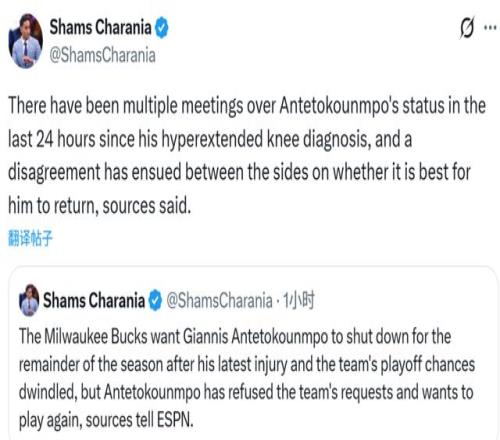 北京時間3月19日,據(jù)名記Shams報道,在字母哥再度受傷、球隊季后賽希望愈發(fā)渺茫之后,雄鹿希望他直接缺席本賽季剩余所有比賽,但這位兩屆MVP拒絕了球隊的要求,堅持想要復(fù)出參賽。過去24小時內(nèi),雙方就字母哥的狀況已進(jìn)行多次會談,但在最佳方案上存在分歧。Shams在節(jié)目中補充表示,這位31歲的球星態(tài)度非常堅決,執(zhí)意要在本賽季復(fù)出。