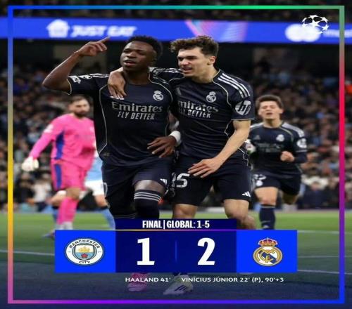 北京時(shí)間3月18日凌晨4點(diǎn),歐冠八分之一決賽次回合較量,首回合3球落敗的曼城主場(chǎng)迎戰(zhàn)皇家馬德里。上半場(chǎng)比賽,B席門前手肘擋出維尼修斯絕佳良機(jī)被直紅罰下,且送出點(diǎn)球,維尼修斯主罰命中,將總比分?jǐn)U大至4比0,隨后哈蘭德后點(diǎn)打空門扳回一城。下半場(chǎng)比賽,多納魯馬化解單刀,多庫(kù)、艾特·努里,巴爾韋德和維尼修斯四人進(jìn)球無效,補(bǔ)時(shí)階段,楚阿梅尼助攻維尼修斯完成雙響。最終,皇家馬德里客場(chǎng)2比1、總比分5比1雙殺曼城,打進(jìn)歐冠8強(qiáng)。