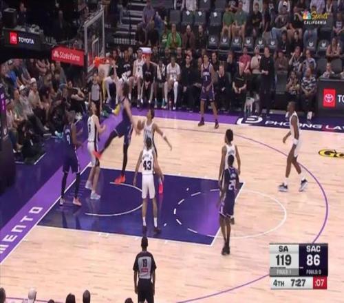 拿上一場對(duì)陣馬刺的比賽來說,國王輸?shù)梅浅8纱?,第一?jié)就落后了17分,最多落后38分,最終以104-132不敵馬刺。