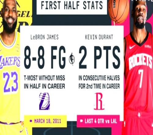上半場比賽,火箭這邊,阿門13中6得到14分6板3助,伊森10中4得到10分6板,史密斯7中4,得到10分3板3助,申京10分2板3助,謝潑德6分1助2斷,奧科吉3分,杜蘭特3中1得到2分4板2助,芬尼-史密斯1板;湖人這邊,東契奇14中6,3分9中3,得到18分6板6助,詹姆斯8投8中,3分2中2,得到18分2板,艾頓8投6中,得到12分2板1助,肯納德5分1助,里夫斯4分4助,八村塁3分3板1助,斯瑪特3分2板4助2斷,拉拉維亞3分1板2助,海斯1分1板1助。
