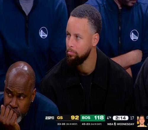 面對(duì)自家殘陣一次又一次拼盡全力卻苦吞失利,因傷缺席卻跟隊(duì)前往客場(chǎng)為隊(duì)友加油助陣的庫(kù)里罕見撇嘴+黑臉。