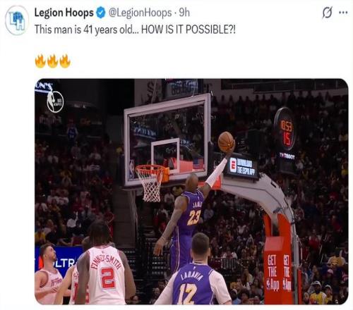 在勒布朗完成單臂劈扣空中接力時(shí),美媒LH寫道:這是41歲球員能做到的事情?