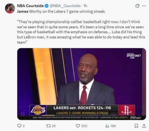 詹姆斯此役34分鐘,14中13,三分2中2,罰球3中2,拿到30分5籃板2助攻1搶斷1蓋帽,命中率92.9%,三分命中率100%,41歲的勒布朗打出如此逆天的效率讓東契奇都贊不絕口。