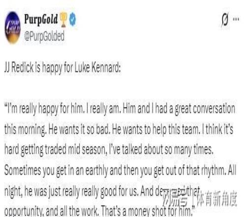接著,雷迪克把話題轉到肯納德身上,他的語氣變得格外真摯,眼中滿是欣慰:“我真心為肯納德感到高興,這種高興是從心底里自然流淌出來的。今早我還特意和他進行了一次深入的促膝長談。我能深刻感受到,他內心深處極度渴望在賽場上證明自己,就像一位懷揣著偉大夢想的勇士,一心想要為球隊披荊斬棘、立下赫赫戰(zhàn)功。