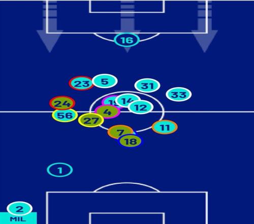 在意甲第30輪對陣都靈的比賽中,阿萊格里通過陣型的微調(diào)讓球隊打入3粒進球并全取三分。雖然官方給出的米蘭陣型還是3-5-2,但從賽后的站位分布圖可以看出,紅黑軍團的陣型更加接近4-3-3。