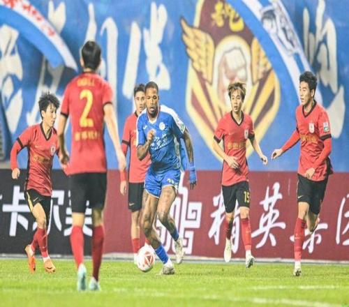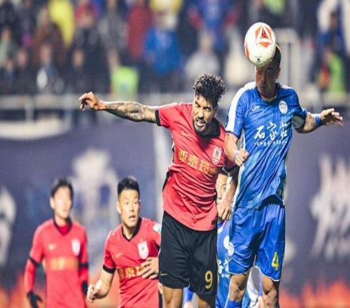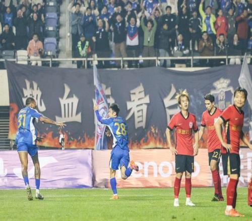 3月21日,石家莊功夫28號(hào)張煜東(左二)慶祝進(jìn)球。