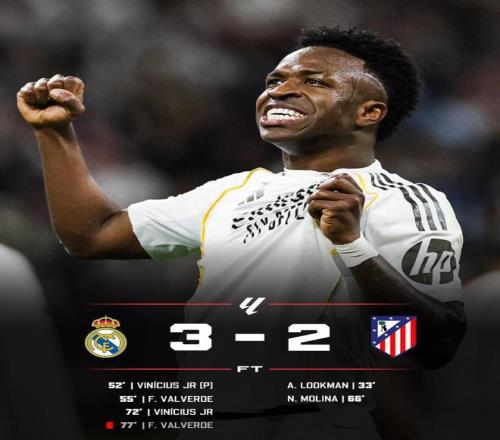 第77分鐘,巴爾韋德戰(zhàn)術犯規(guī)被直接紅牌罰下,馬競看到了翻盤的希望,隨后大舉壓上瘋狂進攻。最后十多分鐘,皇馬10人死守,盧寧、呂迪格與姆巴佩的連續(xù)解圍才把3-2的比分守到終場。復仇成功的皇馬拿下各項賽事五連勝,繼續(xù)對巴薩施加壓力。