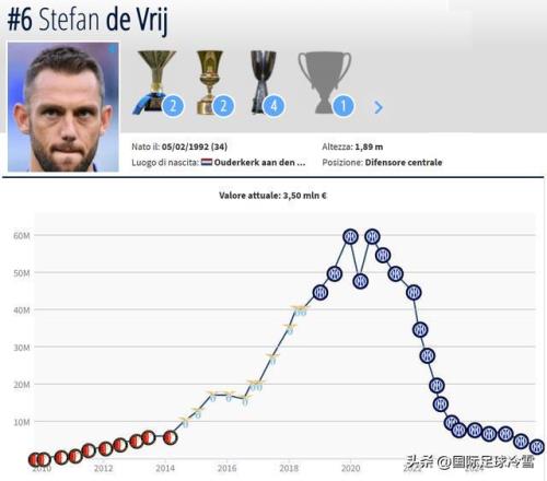 舉個例子:國米后衛(wèi)德弗賴,2020年時他的身價達到生涯巔峰的6000萬歐元,在短短4-5年內(nèi),他的身價就下滑到了500萬歐元(如今只有350萬)。這固然與他在俱樂部,國家隊的地位下滑有關(guān),但根本的原因還是隨著年紀的不斷提升,他的身價每次更新都會下降——即便球員表現(xiàn)好的時候,也只是降的慢一點而已,趨勢是不會變的。