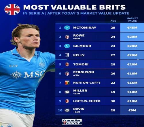 北京時(shí)間3月24日,在更新了意甲球員的身價(jià)之后,德轉(zhuǎn)統(tǒng)計(jì)出了此次更新后意甲身價(jià)排名前10的英國球員,麥克托米奈以4500萬歐元排名第1,勞埃德-凱利、托莫里、洛夫圖斯-奇克上榜。