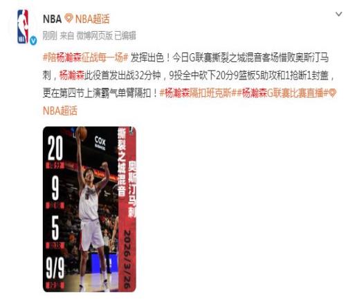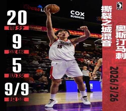 北京時間3月26日,撕裂之城混音隊客場對陣奧斯汀馬刺隊,楊瀚森再度被下放到發(fā)展聯盟征戰(zhàn)。楊瀚森首次9中9彈無虛發(fā),其中三分2中2,貢獻20分9籃板5助攻1搶斷1蓋帽,難阻最終撕裂之城混音隊93-99輸給奧斯汀馬刺隊,NBA官方賽后曬海報盛贊楊瀚森表現。