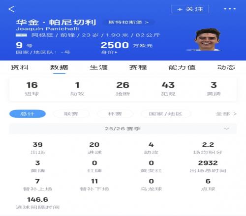 帕尼切利現(xiàn)年23歲,身高190司職中鋒,本賽季代表法甲斯特拉斯堡出場39次,打進20球送出4次助攻。其中法甲聯(lián)賽目前進了16球,排在第一。