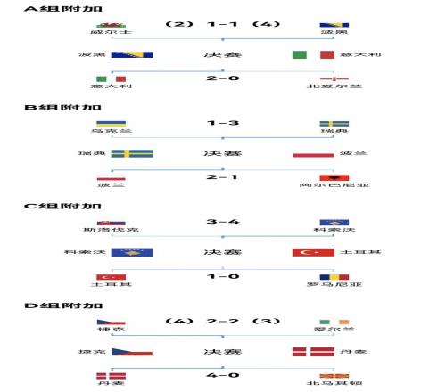 體育播報3月27日宣 世界杯預選賽歐洲區(qū)附加賽半決賽全部結(jié)束,8場單場決勝的較量過后,4組決賽對陣正式出爐,同時有8支球隊遺憾止步,告別本屆世預賽征程。