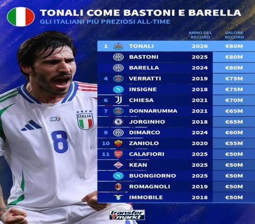 北京時(shí)間3月27日,在世預(yù)賽歐洲區(qū)附加賽半決賽中,托納利貢獻(xiàn)的一射一傳幫助意大利2-0淘汰北愛爾蘭,賽后德轉(zhuǎn)統(tǒng)計(jì)出了意大利球員歷史身價(jià)榜,托納利與巴斯托尼、巴雷拉同以8000萬歐元并列第一。