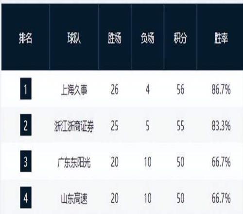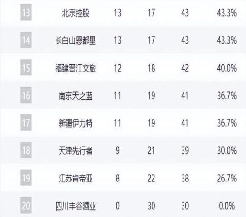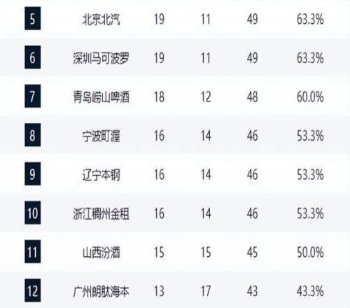 青島隊以18勝12負升至第7,寧波、遼寧、浙江三隊同為16勝14負,形成激烈纏斗的“16勝集團”。山西隊15勝15負,勉強站上勝率50%線。廣州隊與北控、吉林隊同為13勝17負,分列第12至14名,成為季后賽邊緣球隊。其中廣州憑借小分優(yōu)勢暫居“守門員”位置,但隨時可能被反超。